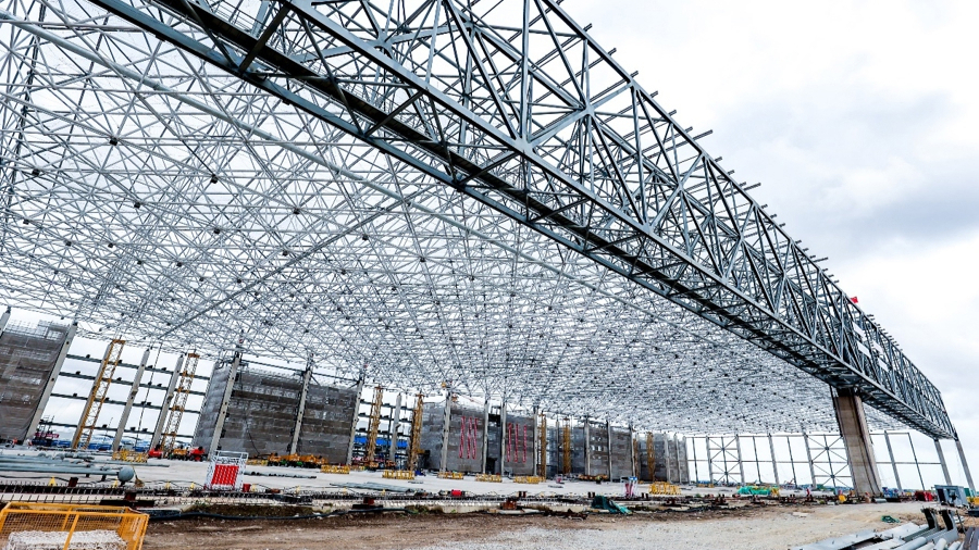 1号机库作为项目核心枢纽,机库大厅跨度达313.5米、进深140.35米,可同时容纳9架宽体机和2架窄体机作业,建成后铭创配资将成为目前亚洲乃至世界范围内少有的大跨度、大进深宽体机维修专用机库。如此规模的钢网架结构,在设计精度、吊装技术、安全管控等方面均达到行业高难度水平。